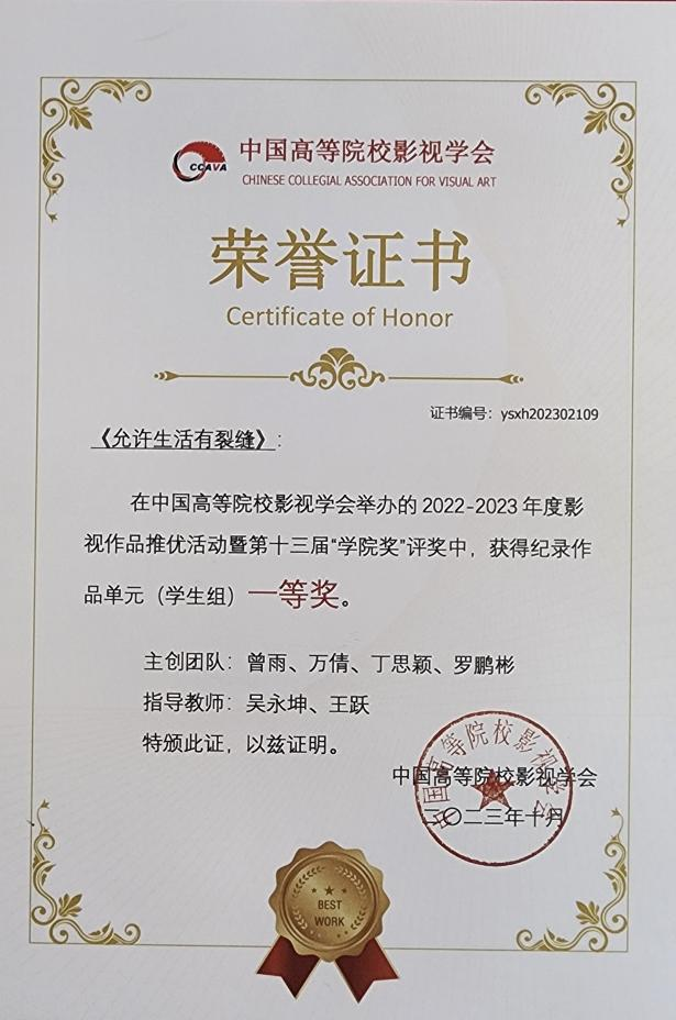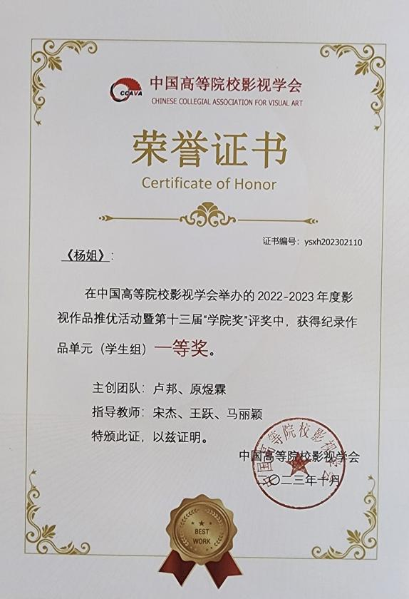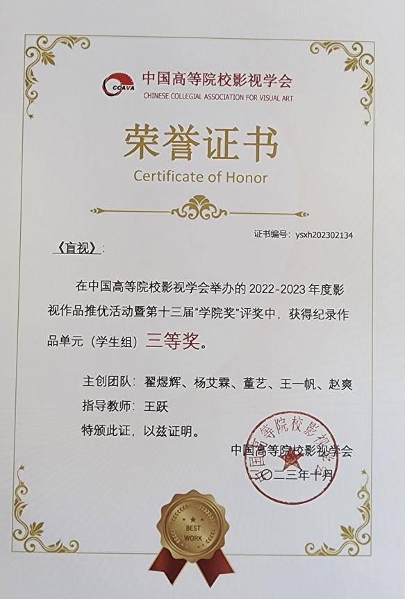 10月21日19:00,中国高校影视学会成立40周年纪念庆典2022-2023年度推优活动表彰仪式于北京电影学院怀柔校区千人剧场正式启幕。买球投注官方网站电影电视学院《杨姐》、《允许生活有裂缝》荣获纪录作品单元 (学生组) 一等奖,《雷打石》获得二等奖,《盲视》获得三等奖;学生联合作品《野蛮生长》获剧情作品单元学生组一等奖,《耳顺之年》荣获剧情作品单元(教师组)二等奖,《冲喜》获得剧情作品单元(学生组)三等奖。
