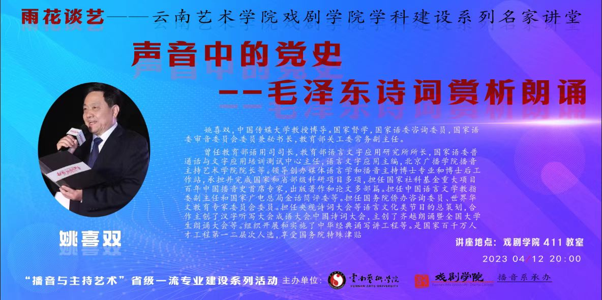 姚喜双教授曾任教育部语言文字应用管理司司长、教育部语言文字应用研究所所长、国家语委普通话与文字应用培训测试中心主任、《语言文字应用》主编、北京广播学院播音主持艺术学院院长等,领导创办媒体语言学和播音主持博士专业和博士后工作站,承担并完成多项国家和省部级科研项目,出版著作和论文多部篇。目前,担任国家社科基金重大项目——“百年中国播音史”首席专家,担任中国语言文学教指委副主任,担任中央广播电视总台《中国诗词大会》、《汉字听写大会》、《成语大会》等语言文化类节目的总策划及主创成员,主创了齐越朗诵节暨全国大学生朗诵大会,组织开展和实施了教育部“中华经典诵写讲工程”等。是国家百千万人才工程第一二层次人选,享受国务院特殊津贴。