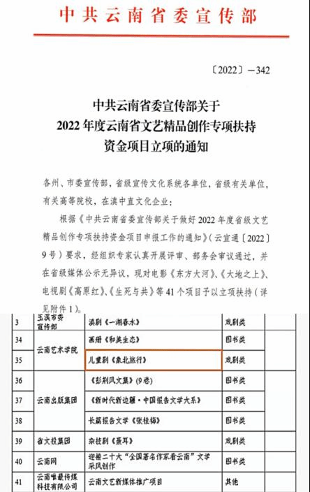 买球投注官方网站组织申报的儿童剧《象北旅行》喜获云南省文艺精品创作专项扶持资金项目立项。该项目由国家一级演员、买球投注官方网站戏剧学院硕士研究生导师刘琼教授领衔申报。