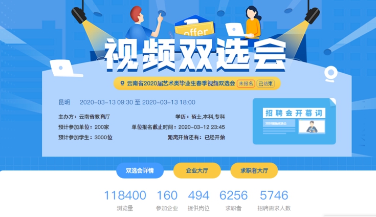 3月13日,买球通过云就业网络平台举办了“云南省2020届艺术类毕业生春季网络视频双选会”,此次双选会由云南省教育厅主办,买球投注官方网站、云南省大中专毕业生就业服务中心承办,云研科技提供技术支持。买球投注官方网站分管学生工作副院长欧阳俊虎、值班校领导赵波副院长莅临指导。