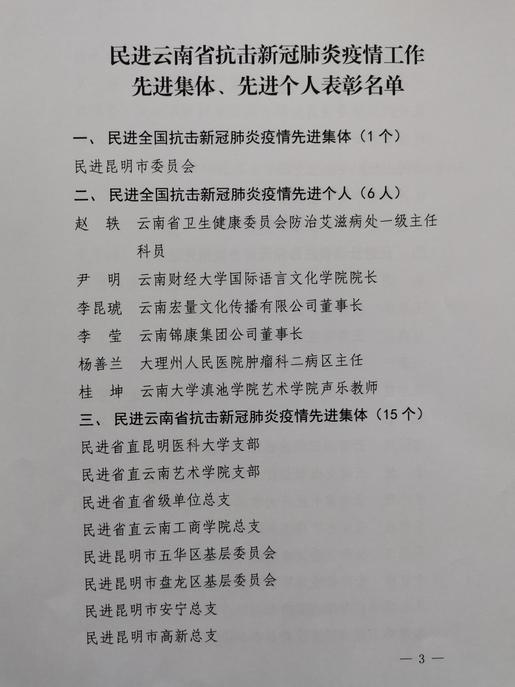 民进买球投注官方网站支部积极响应民进云南省委的号召,大力弘扬“生命至上、举国同心、舍生忘死、尊重科学、命运与共”的伟大抗疫精神,在抗击新冠肺炎疫情工作中做出突出贡献,被民进云南省委授予“民进云南省抗击新冠肺炎疫情工作先进集体”称号,为学校赢得荣誉。