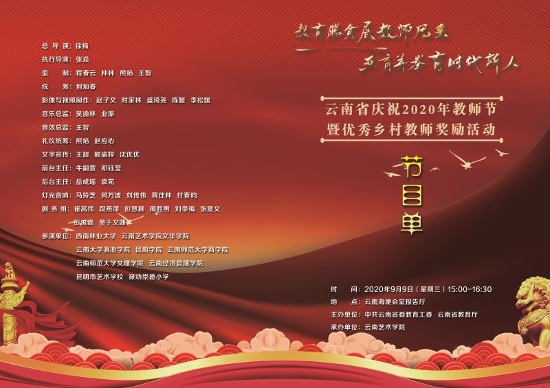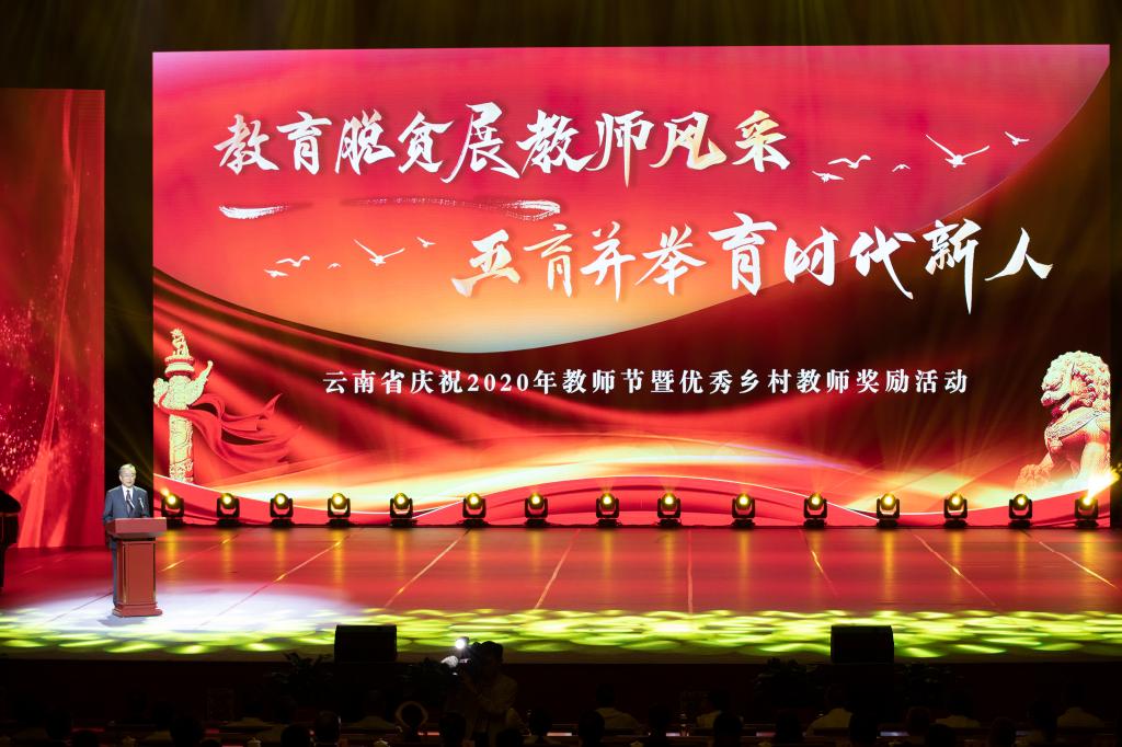 2020年9月9日,由中共云南省委教育工委、云南省教育厅主办,买球投注官方网站承办的“云南省庆祝2020年教师节暨优秀乡村教师奖励活动”在昆明海埂会堂隆重举行,活动向全省广大教师、教育工作者和离退休教师致以节日的问候和美好的祝愿。