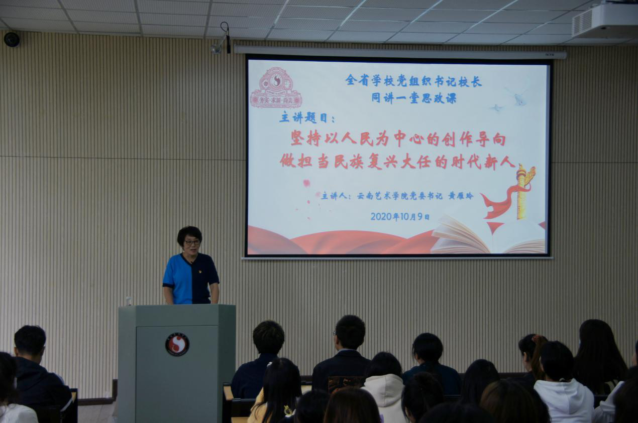 按照中共云南省委教育工委、云南省教育厅《关于组织全省学校党组织书记校长同讲一堂思政课的通知》精神,10月9日下午,我校党委书记黄雁玲同志在公共教学楼A101为学生上了一堂题为“坚持以人民为中心的创作导向,做担当民族复兴大任的时代新人”的思想政治理论课。