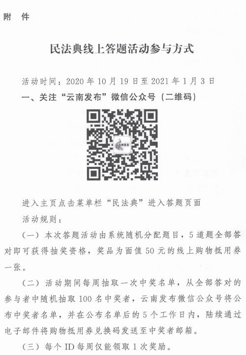 为深入贯彻习近平总书记关于全面依法治国的重要论述特别是关于民法典的重要指示精神,全面推进民法典普法教育工作,按照云南省民法典学习宣传总体安排部署,省委宣传部、省普法办决定运用云南省权威信息发布平台“云南发布”、省普法办“云南普法”两个微信公众号在全省范围开展“云南省民法典学习线上答题”活动,活动有关事项通知详见附件。