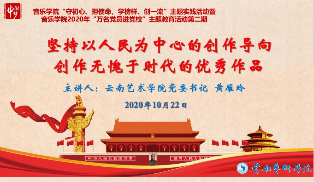 10月23日,音乐学院举行“守初心、担使命,学榜样、创一流”主题实践活动暨音乐学院2020年“万名党员进党校”主题教育活动第二期讲座,邀请买球投注官方网站党委黄雁玲书记到学院讲授《坚持以人民为中心的创作导向 创作无愧于时代的优秀作品》专题党课。参加专题党课学习的有音乐学院教职工、学生党员、发展对象、入党积极分子共270人,音乐学院党总支纳海书记主持专题党课。