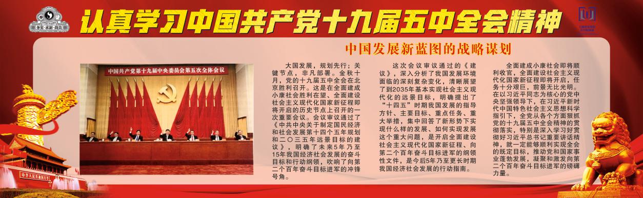三是通过部门宣传栏,宣传党的十九届五中全会精神。大国发展,规划先行;关键节点,非凡部署。金秋十月,党的十九届五中全会在北京胜利召开。这是在全面建成小康社会胜利在望、全面建设社会主义现代化国家新征程即将开启的历史节点上召开的一次具有历史性、全局性的重要会议。会议审议通过的《中共中央关于制定国民经济和社会发展第十四个五年规划和二〇三五年远景目标的建议》,明确了未来5年乃至15年我国经济社会发展的奋斗目标和行动纲领,吹响了向第二个百年奋斗目标进军的冲锋号角。