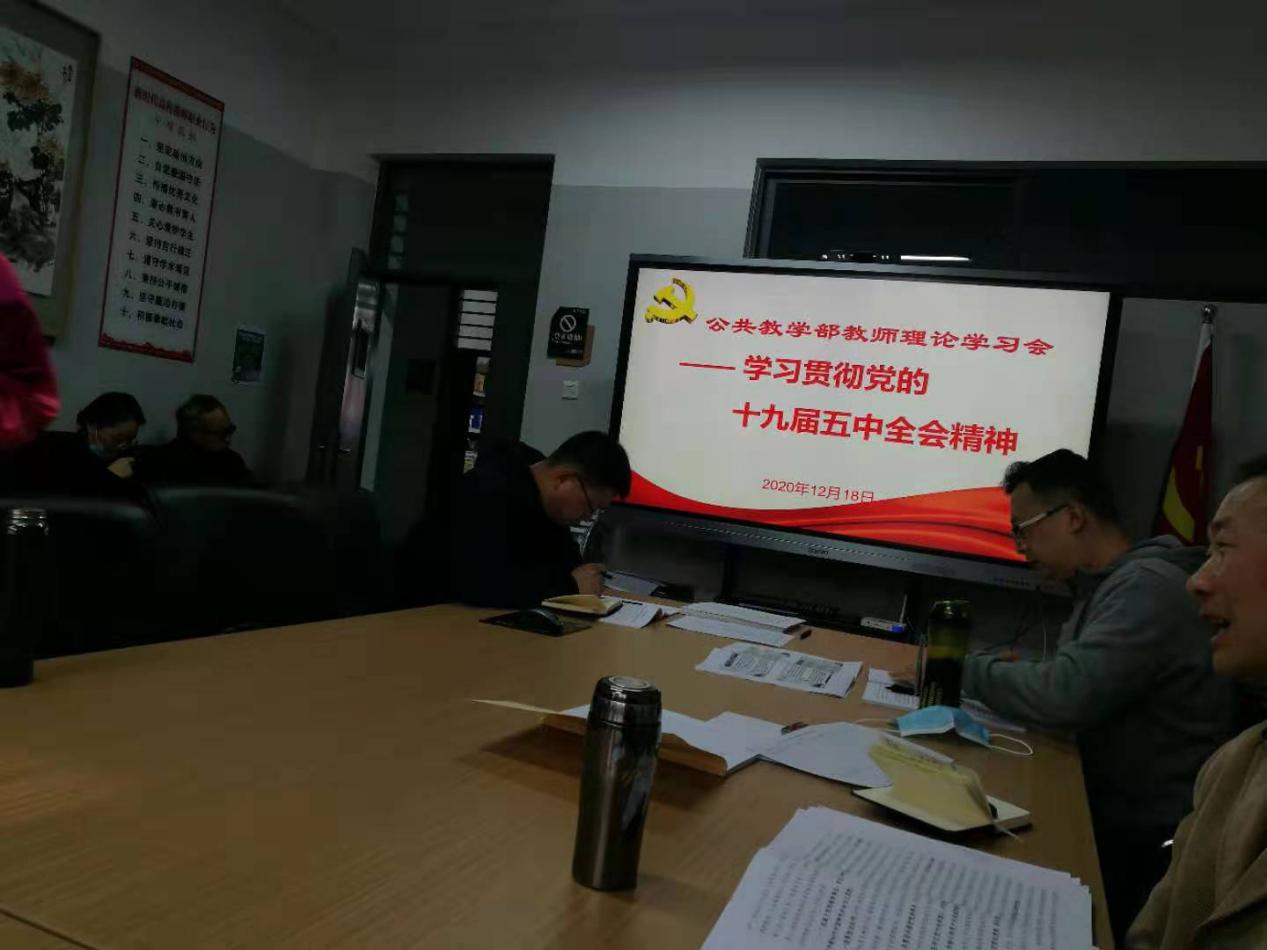 二是召开教师政治理论学习会,学习宣传贯彻党的十九届五中全会精神。2020年12月18日,公共教学部在公教楼B106会议室召开教师政治理论学习会,深入学习贯彻党的十九届五中全会精神。全体教职工参加了学习会。
