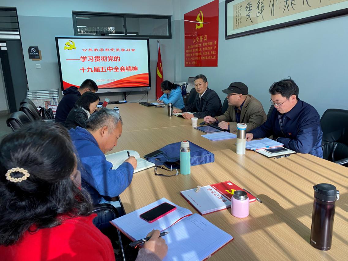 根据党中央、教育部、云南省委、省教育工委、教育厅和学校党委的安排部署,公共教学部党总支结合部门实际,以多种方式及时认真学习宣传贯彻党的十九届五中全会精神。一是召开党员学习会,学习宣传贯彻党的十九届五中全会精神。2020年11月20日,公共教学部党总支在公教楼B106会议室召开党员学习会,学习宣传贯彻党的十九届五中全会精神。学校党委委员、联系公教部校领导张国岗同志到会指导,宣讲全会精神并提出工作要求。公教部全体党员教师参加学习。