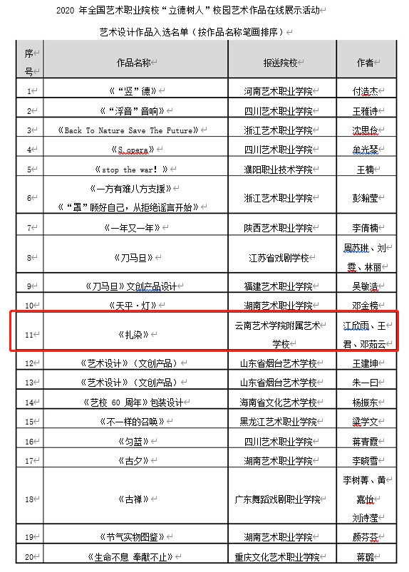 由文化部和旅游部科技教育司指导、全国文化艺术职业教育教学指导委员会主办、山西艺术职业学院和中国艺术职业教育学会承办的“2020年全国艺术职业院校‘立德树人’校园艺术作品在线展示活动”在各院校大力支持和积极参与下,已完成作品征集和专家评审,买球投注官方网站附艺校共四项参评作品成功入选。
