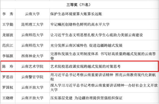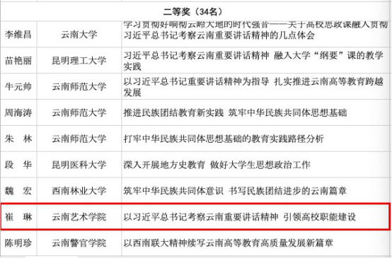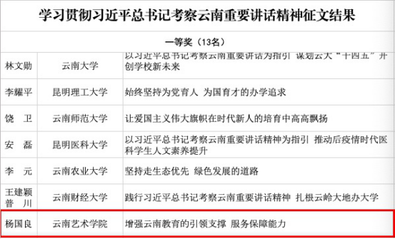 中共云南省委教育工委开展了学习贯彻习近平总书记考察云南重要讲话精神征文活动。买球党委副书记杨国良的征文《增强云南教育的引领支撑 服务保障能力》荣获一等奖,马克思主义学院教师崔琳的征文《以习近平总书记考察云南重要讲话精神 引领高校职能建设》荣获二等奖,马克思主义学院教师陈玲的征文《艺术院校思政课实现跨越式发展的对策思考》荣获三等奖。