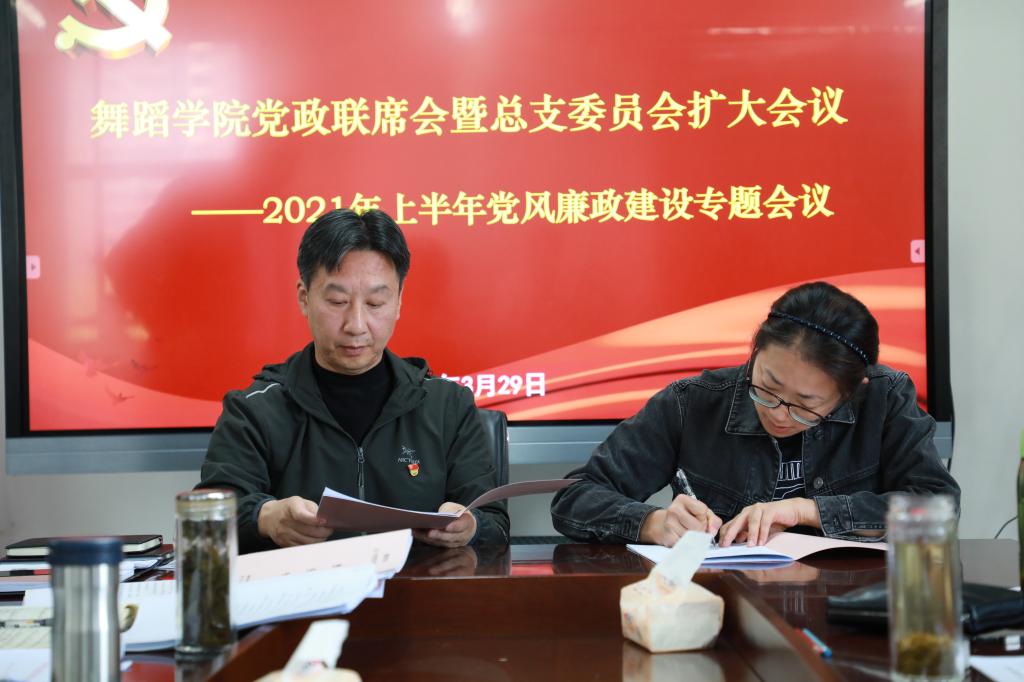 为全面贯彻落实中央关于全面从严治党和党风廉政建设的决策部署和工作安排,按照学校关于党风廉政建设工作要求和部署, 2021年3月29日上午,舞蹈学院召开舞蹈学院党政联席会议暨党总支委员会扩大会议——2021年上半年党风廉政建设专题会议。舞蹈学院党政班子成员,党总支委员,副科以上干部,参加会议,校纪委书记姜玉海同志作为联系舞蹈学院工作的校领导参加了此次会议,会议由舞蹈学院党总支孟文书记主持。