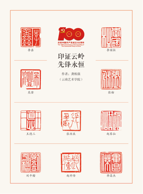 翻开中国共产党云南地方党史,总有一些熠熠生辉的名字,让我们动容,总有一种精神力量,在激励我们前进,这就是共产党人坚定的理想信念和崇高的人生境界。丰碑不朽、精神永恒,即使站在新的历史起点上,我们依然需要这些名字的光照,需要这种精神的弘扬。因此,在隆重纪念建党100周年的这个历史时刻,设计学院龚栋强老师用篆刻的传统艺术形式,介绍和展示建党100年来云南在革命、建设、改革开放各个历史时期作出突出贡献的100位优秀共产党员,作品深入挖掘100位云南优秀共产党员背后的故事,针对每位党员先锋所属的行业,个人独特的人格魅力和所取得的显赫成就深入挖掘,从印章的章法布局和印面的整体风格上精心设计,篆刻出个性鲜明又意义深刻的时代楷模印。铭记和传承优秀共产党员的奋斗精神,讴歌赞扬党的云南楷模,“榜样是看得见的哲理”,向先锋看齐,向英雄学习,筑起的将是永不流失的精神钙质,用伟大的共产党人奋斗精神塑造和滋养新时代青年,鼓励我们在伟大的新时代不断磨砺自己,肩负起新时代赋予的重任。