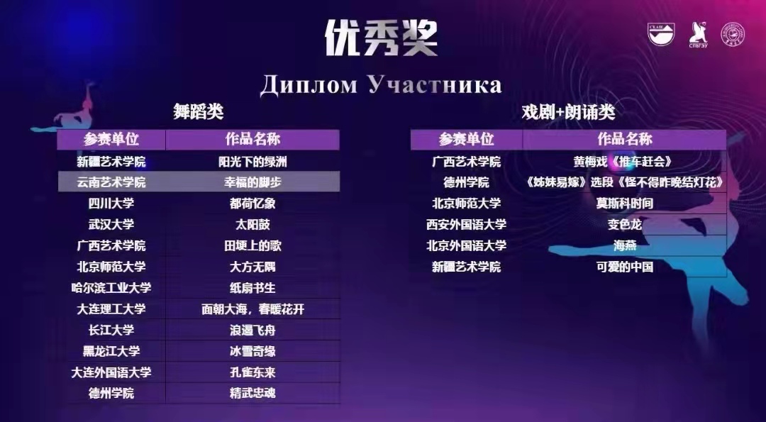 买球投注官方网站受邀参加“2021中俄大学生艺术联欢节”,舞蹈学院选送的彝族女子群舞《幸福的脚步》在此次“2021中俄大学生艺术联欢节”上获优秀奖。