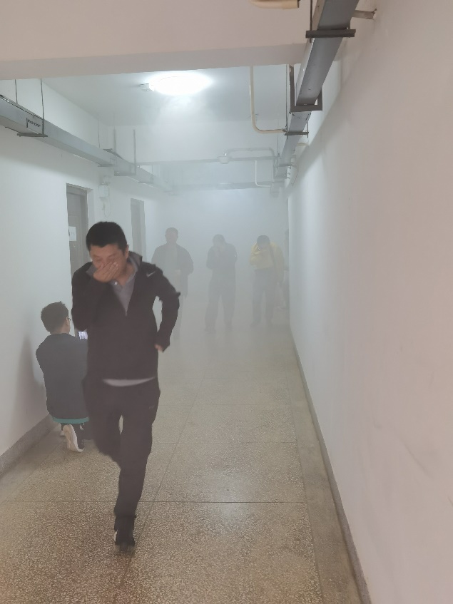 6月8日上午10时30分,基建后勤处、信息与网络管理中心工作人员在青教公寓C栋一楼会议室集中,在模拟火灾发生时的烟雾逐渐浓重之时,随着一声哨响,全体工作人员迅速用衣袖、毛巾掩住鼻口从“火场”有序疏散至指定集中地点。