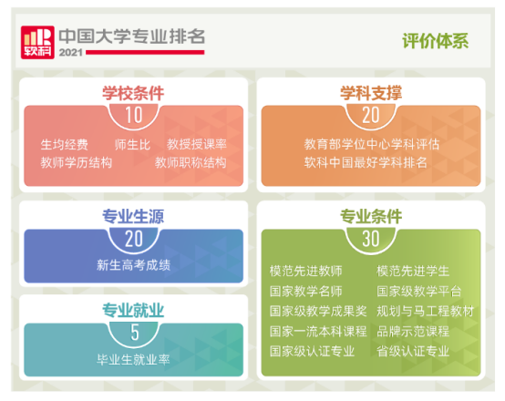 2021年6月22日,高等教育评价专业机构软科正式发布2021“软科中国大学专业排名”。排名包括509个本科专业,每个专业榜单发布的是所有开设该专业的高校中排名位列前50%的高校,共有925所高校的28550个专业上榜。