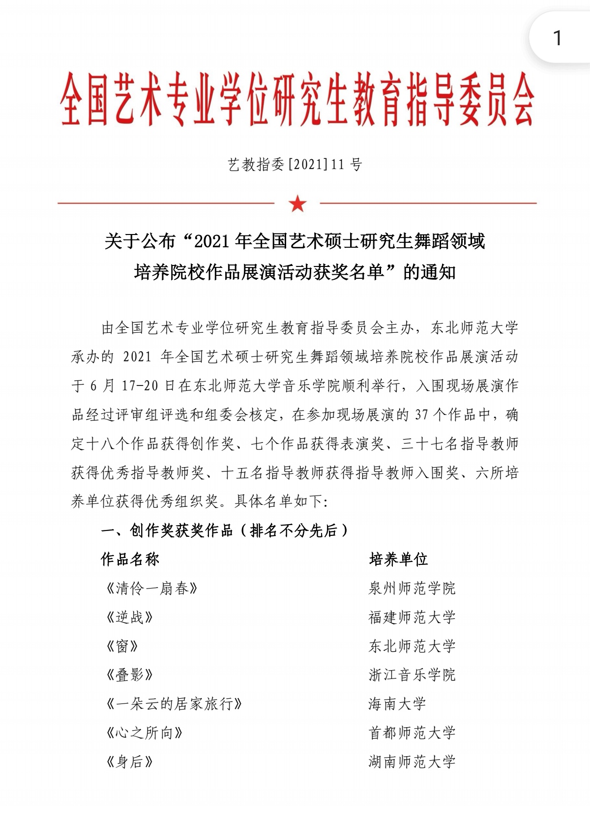 舞蹈学院在此次全国艺术硕士研究生舞蹈领域培养院校作品展演活动中,所取得的成果是作为我院研究生教育教学成果的一次有力审核和检阅,充分展现了我院的思政教育艺术成果与研究生的创新实践能力。