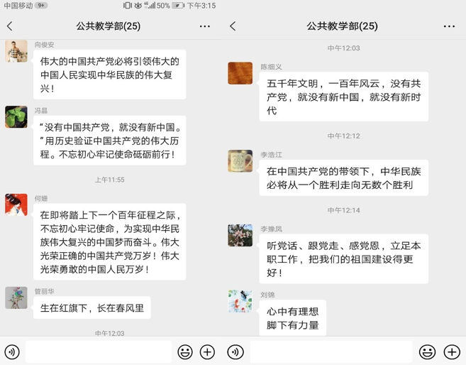 公共教学部的全体干部教师,在观看了今天上午党中央庆祝中国共产党成立100周年大会直播实况,聆听了习近平总书记发表的重要讲话后,心情澎湃,感慨万千,在座谈会交流后,大家继续通过部门微信群热议建党百年,交流感想心声。