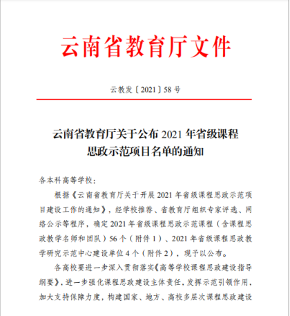 根据《云南省教育厅关于公布2021年省级课程思政示范项目名单的通知》(云教发〔2021〕58号),买球《壁画创作》《应用戏剧实践2》《云南少数民族电影》《云南民族音乐概论》四门课程及教学团队,被认定为省级课程思政示范课程。同时,“买球投注官方网站课程思政教学研究中心”被认定为“省级课程思政教学研究示范中心”。