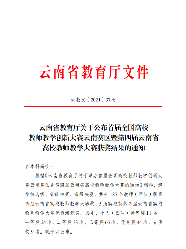 根据《云南省教育厅关于公布首届全国高校教师教学创新大赛云南赛区暨第四届云南省高校教师教学大赛获奖结果的通知》,买球多个团队获奖。