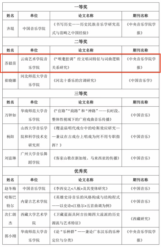 2022年11月28日,中国传统音乐学会于中国传统音乐学会第22届年会闭幕式上宣布“第二届中青年学者论文评选”获奖名单,买球投注官方网站音乐学院苏毅苗教授的《“呗耄腔调”经文唱词特征与词曲逻辑关系研究》荣获本次论文评选中年学者组二等奖。该组别设一等奖1名,二等奖2名,三等奖3名。