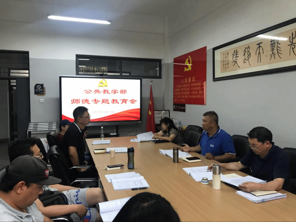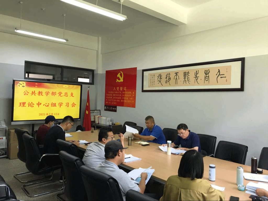 2021年7月13日,在公共教学楼B106会议室,公共教学部党总支理论学习中心组召开集体学习会,深入学习贯彻习近平总书记在庆祝中国共产党成立100周年大会上的重要讲话和党的教育方针,开展师德专题教育。参会人员有公教部党政领导、总支委员、支部书记、办公室主任、教研室主任和分工会主席。会议由公教部党总支书记杨祝飞同志主持。