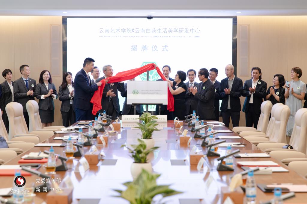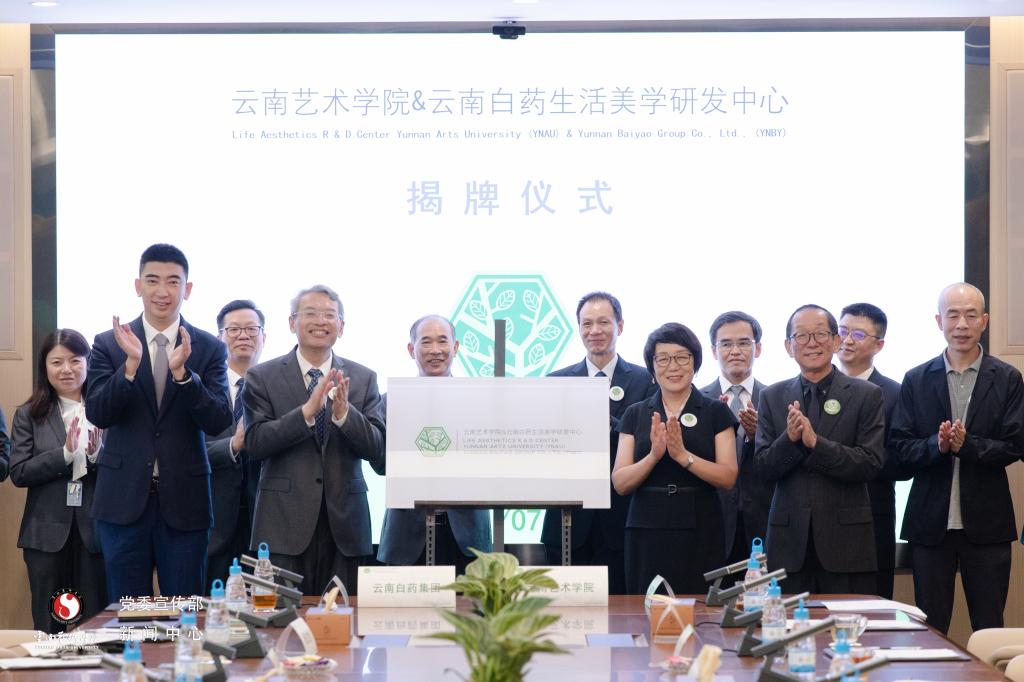 黄雁玲书记、郭浩院长和云南白药汪戎书记、首席执行官董明先生为中心揭牌。仪式上,陈劲松副院长代表美学中心发言,他指出,该中心将作为美学研究设计、校企合作实践、人才培养模式改革的平台,承担学术创新、人才培养、企业项目设计及文化建设提升等功能,积极推进生活美学和大健康产业的融合发展,在“绿色食品”“健康生活目的地”“新生活美学”等产业领域有新布局、新突破。