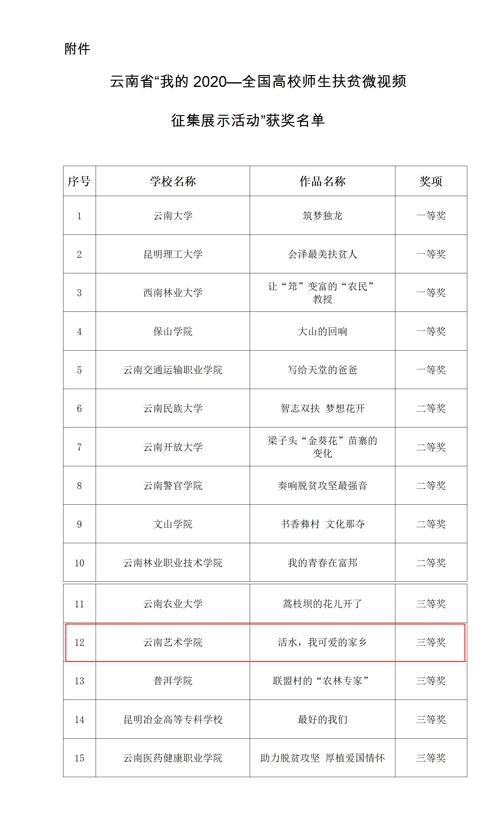 根据《中共云南省委教育工委办公室关于组织开展“我的2020-全国高校师生扶贫微视频征集展示活动”的通知》精神,通过层层推荐,专家评审,买球投注官方网站《活水,我可爱的家乡》作品荣获三等奖。