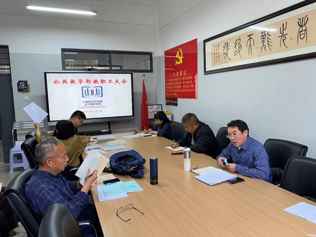 2021年9月3日,公共教学部在公共教学楼B106会议室,召开2021-2022学年第一学期开学教职工大会,部署安排新学期党的建设和教育教学等工作,开展师德典型案例警示专题教育。会议由党总支书记杨祝飞主持,学院党委委员、公共教学部主任苏常青和全体教职工参加会议。