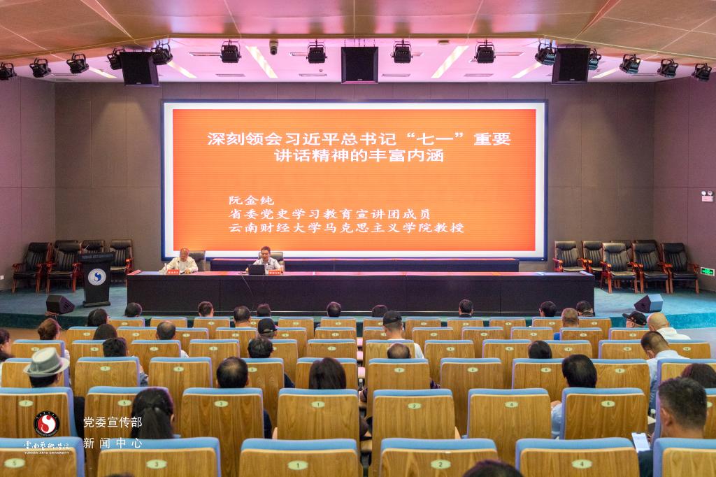 本次宣讲报告会主讲人阮金纯为省委党史学习教育宣讲团成员、云南财经大学马克思主义学院教授。阮金纯同志以《深刻领会习近平总书记“七一”重要讲话精神的丰富内涵》为主题展开宣讲,活动由校党委副书记杨国良主持会议。