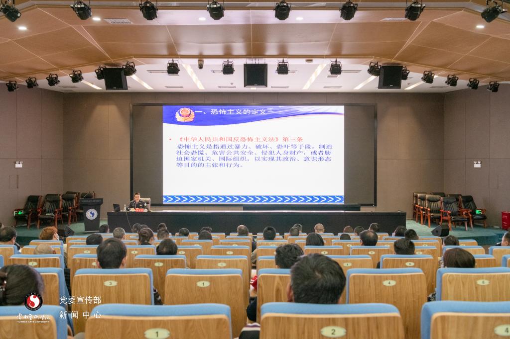 为巩固和提升省级“平安校园”创建成果,进一步落实学校安全稳定工作,提高师生对于恐怖主义的认识,云南省公安厅、云南省高级人民法院“我为群众办实事”实践活动于10月28日走进买球投注官方网站,进行线上、线下联动,这是在高校开展巡回讲座的第一站。买球相关职能部门、二级学院负责人、辅导员、班主任、学生治安大队及师生代表近200人参加活动。活动由买球党委副书记杨国良同志主持。