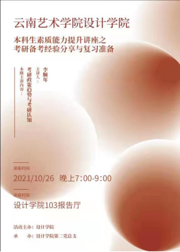 升学率提升作为本科教学质量的重要内容,也作为学院教学工作的重点方向受到重视。经分管本科教学杨凌辉副院长、分管研究生教学科研万凡副院长与分管学生工作王进副书记提议,经学院研究,由设计学院教学管理科协同学生管理科面向学院有意向了解考研和备考的本科生持续开展“本科生素质能力提升讲座之考研备考经验分享与复习准备”专场讲座。