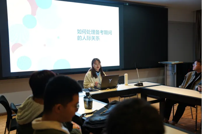 接下来是储思敏同学分享的《如何处理备考期间的人际关系》,分别讲述了与父母、与舍友、与研友、与男女朋友之间的关系处理方法。
