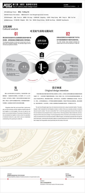 内蒙古农业大学团队作品“擀毡”,以蒙古族传统精神中提炼而来的潜性基因——“白”,作为此次创作的核心思想,这贯穿了整体设计和形式语言。作品以内蒙古地区地理等高线为线索,贯穿狭长的作品,从生命、环境、人文等多重角度出发,凝练概括不同地区的动植物形态,并通过人文化的内化和理解,用抽象和几何式的造型,去构成作品。狭长的作品表达了文化应有的开放性和多元性,力求把对多元的文化、多元的生命和多元的价值观融入其中。
