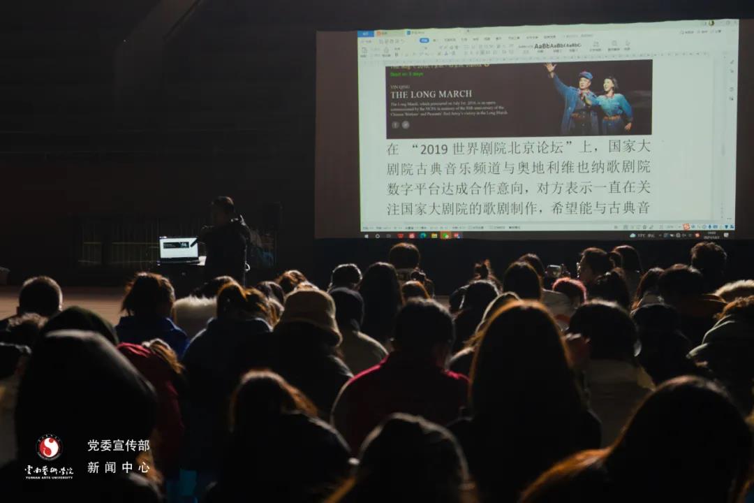 “长征的伟大历史造就我们今天的和平生活,长征精神的每一个音符都蕴含着时代因子,都具有催人奋进、撼人心魄的精神力量。”此次赏析公开课的主讲人郭年平副教授说。随后,他从歌剧电影《长征》的创作源头、创作背景、创作内容、创作意义、创作团队、故事梗概、主要角色及获奖经历8个方面进行讲授。郭年平教授以极高的专业素养和幽默有趣的交流方式,将歌剧知识、艺术魅力和长征精神延伸至生活,现场座无虚席,反响热烈。