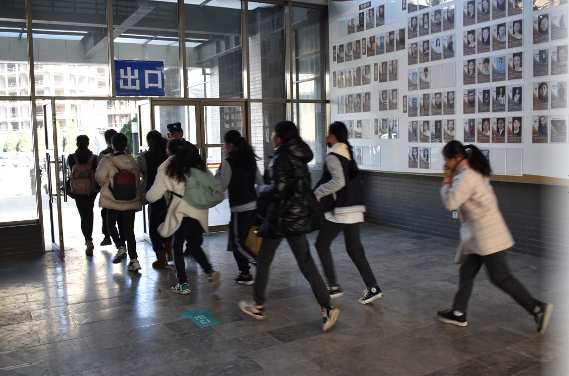11:45分,全体学生到达操场后,各班主任开始清点人数,并将集合人数报告给学保科,学保科杨富老师向农布七林校长汇报情况。随着农布七林校长“演练开始”一声令下,全体学生迅速回到教室待命,演练正式拉开帷幕。12:18分,预警哨声响起,各班主任立即告知学生“发生火灾了,大家不要慌”,马上指挥学生蹲在课桌旁,用手或其他物品护住头部紧急避险,用湿布或衣物捂住口鼻,带领本班队伍弯腰低头,分别从教室前后门成两路纵队进行疏散。各楼层人员指引学生迅速有序地从楼道两侧安全通道紧急撤离至操场指定位置站好,完成人数清点和报告工作。经核实,本次应撤离人数与实际人数相符。整个逃生演练过程行动统一、秩序井然,没有发生拥挤、踩踏和碰伤学生的现象,达到了预期效果。