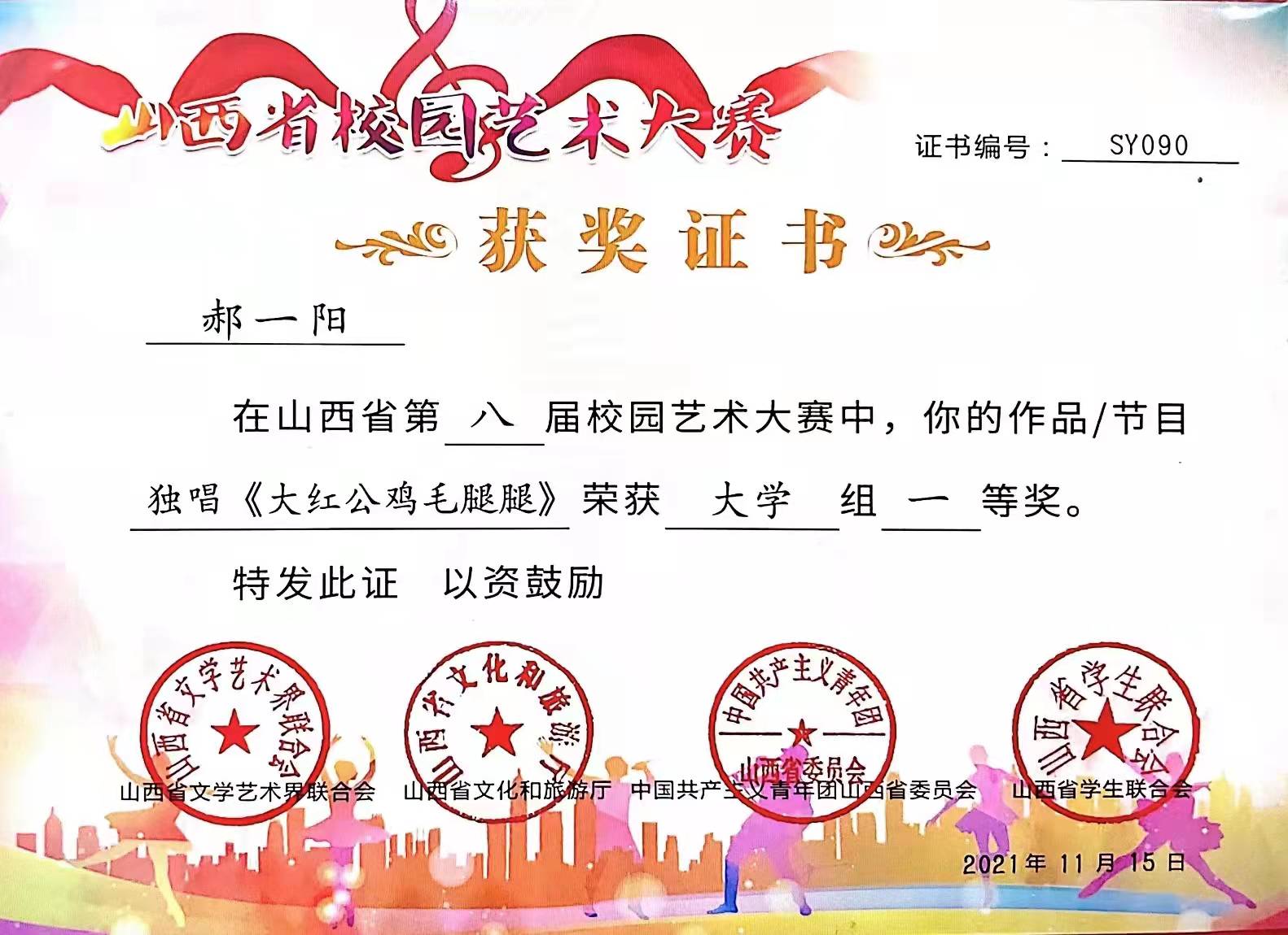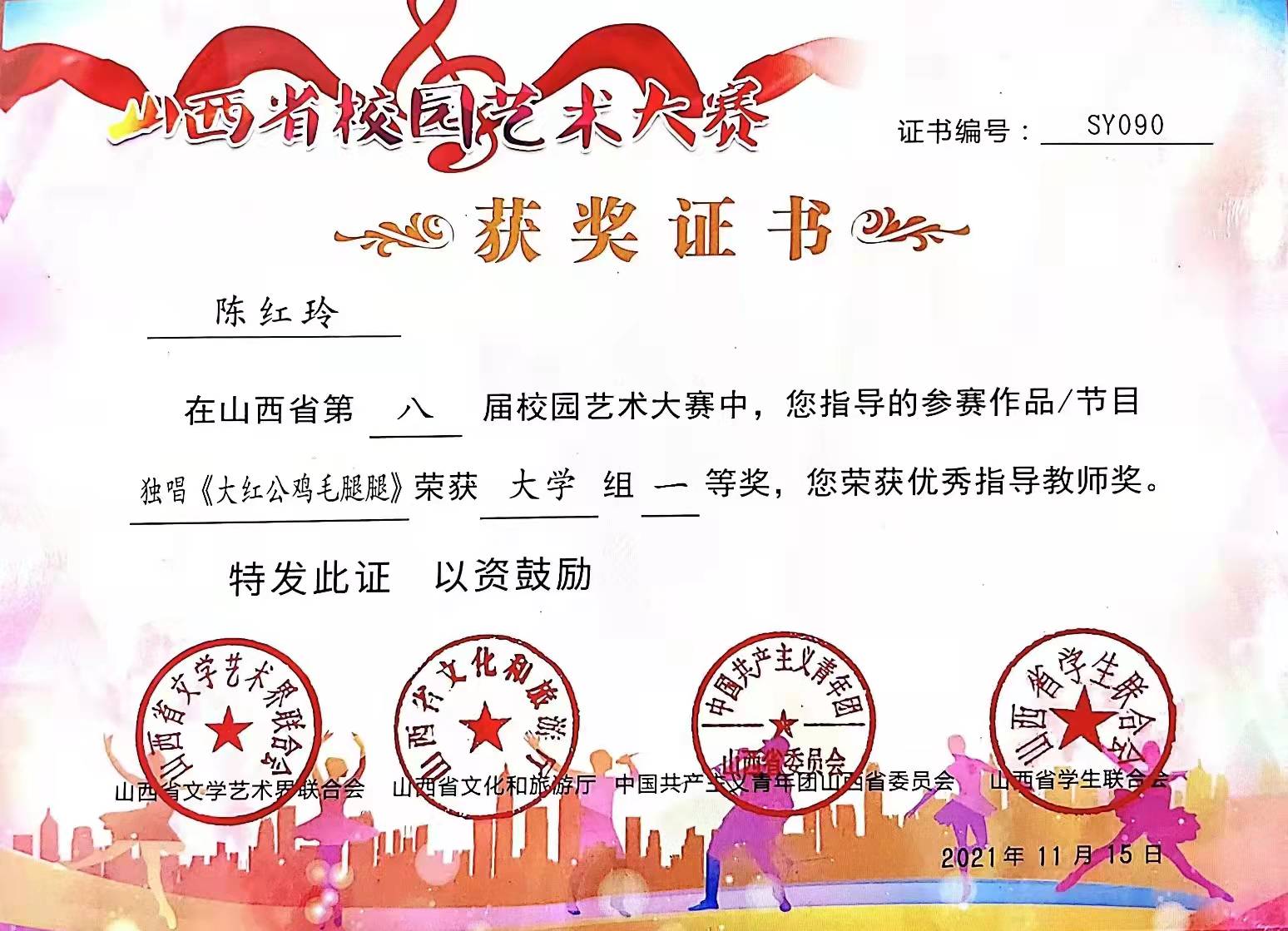 在庆祝中国共产党成立100周年之际,山西省文学艺术界联合会、山西省文化和旅游厅、共青团山西省委、山西省学生联合会于2021年4月至11月联合举办“第八届山西省校园艺术大赛”, 买球音乐学院民族声乐系系主任陈红玲教授荣获“优秀指导教师奖”,民族声乐系学生郝一阳荣获大学生组独唱“一等奖”。