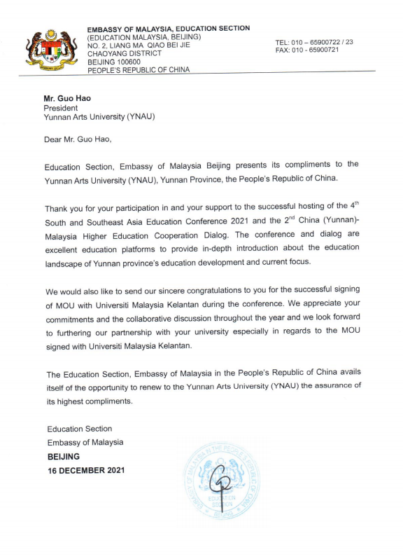 马来西亚大使馆教育处在此谨向中华人民共和国云南省买球投注官方网站表示衷心的感谢。