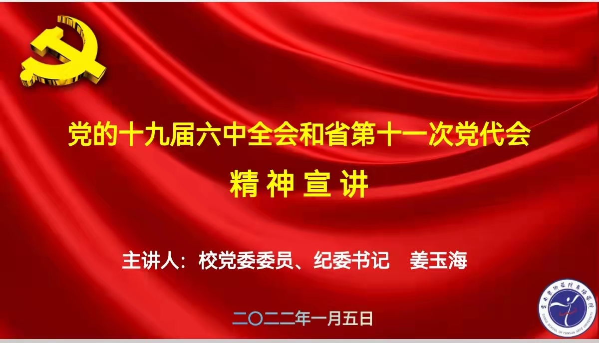2022年1月5日,校党委委员、纪委书记姜玉海到舞蹈学院作党的十九届六中全会和省第十一次党代会精神宣讲。纪检处直属党支部全体人员,舞蹈学院党政领导班子、党总支委员、科级干部(系部主任)、支部书记及行政人员参加此次宣讲学习,宣讲学习会议由校纪检处处长张镇宇主持。