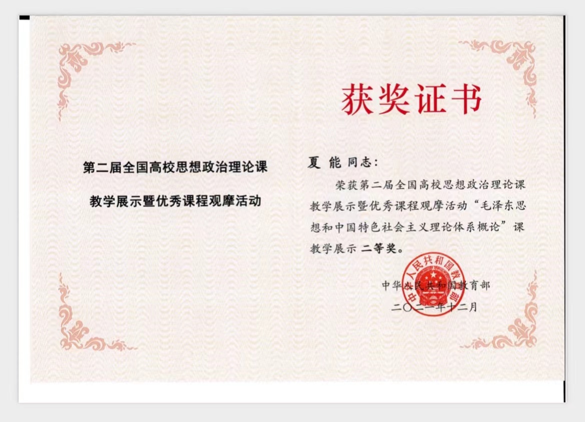 全国高校思想政治理论课教学展示暨优秀课程观摩活动,是目前思想政治理论课教学比赛中规格最高、含金量最高的活动。此次教学展示活动通过遴选推荐教师、制作上传教学资源、形式审查、教学资源网络展示、网络评审、现场教学展示等环节。有600名教师从全国近11万多名思政课教师中脱颖而出,参与了全国第二届高校思想政治理论课教学展示暨优秀课程观摩活动。夏能老师在2021年云南省高校思想政治理论课教学展示活动中荣获一等奖,被推荐参加第二届全国高校思想政治理论课教学展示暨优秀课程观摩活动,最终获得此次活动的二等奖。