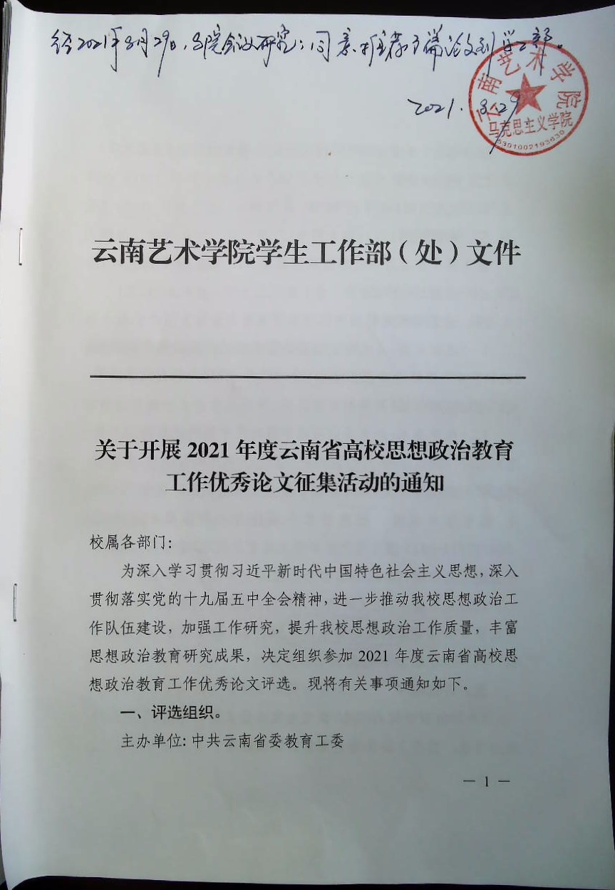 为深入学习贯彻习近平新时代中国特色社会主义思想,深入贯彻落实党的十九届六中全会精神,进一步推动买球思想政治工作队伍建设,加强工作研究,提升买球思想政治工作质量,丰富思想政治教育研究成果,反哺思想政治理论课课堂教学,2021年8月29日,买球投注官方网站马克思主义学院经会议研究,推荐3篇论文提交到学校学工部,参加此次征文比赛活动。