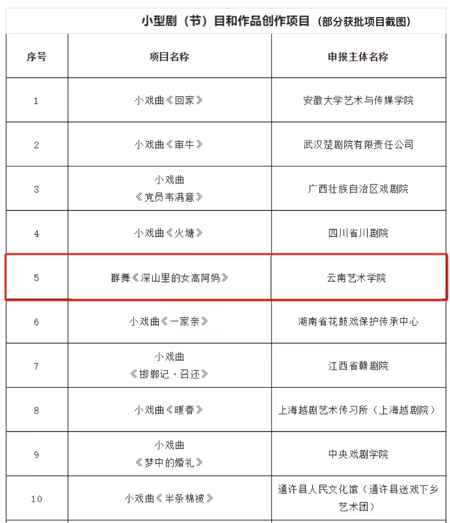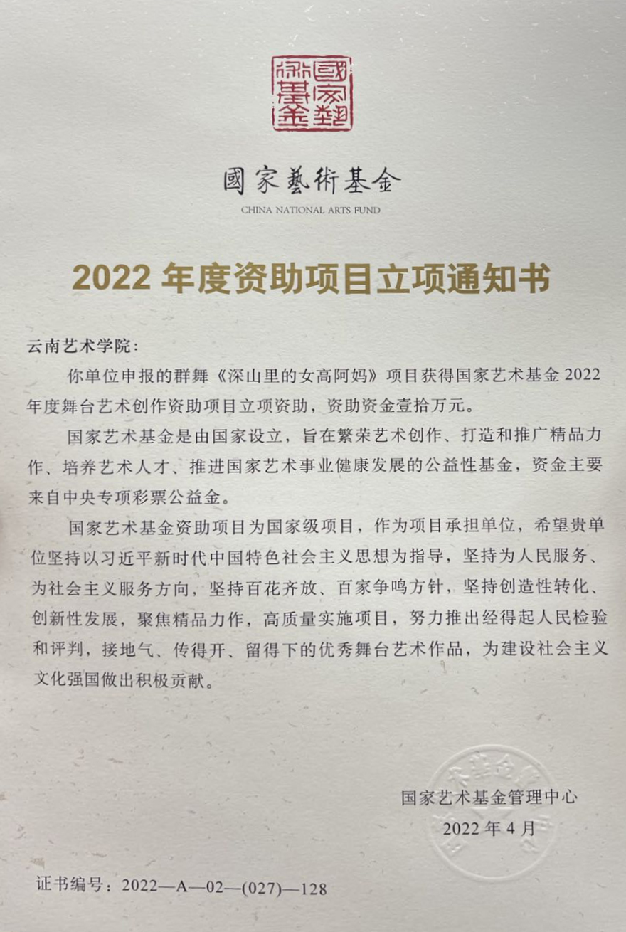 2022年3月1日,国家艺术基金管理中心公布了国家艺术基金(一般项目)2022年度资助项目名单。经专家评审,国家艺术基金专家委员会复核、理事会审定,附艺校舞蹈《深山里的女高阿妈》获批立项,这是附艺校首次在国家艺术基金项目申报工作中获批立项,同时该作品也是2022年度云南省唯一获批立项的舞蹈类小剧目。
