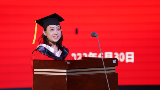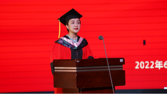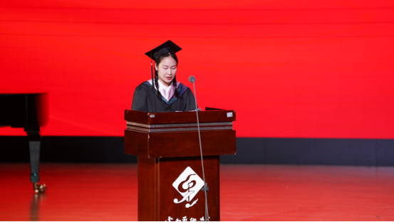 本科生代表林垠君同学分享了大学四年的点滴历程和美好回忆。林垠君表示,走向社会、走入职场,将继续秉持“务实、求新、尚美”的校训,坚持“相互欣赏,彼此成就”的待人原则,坚定志向,勇于拼搏,努力成为勇担民族复兴重任的时代新人。