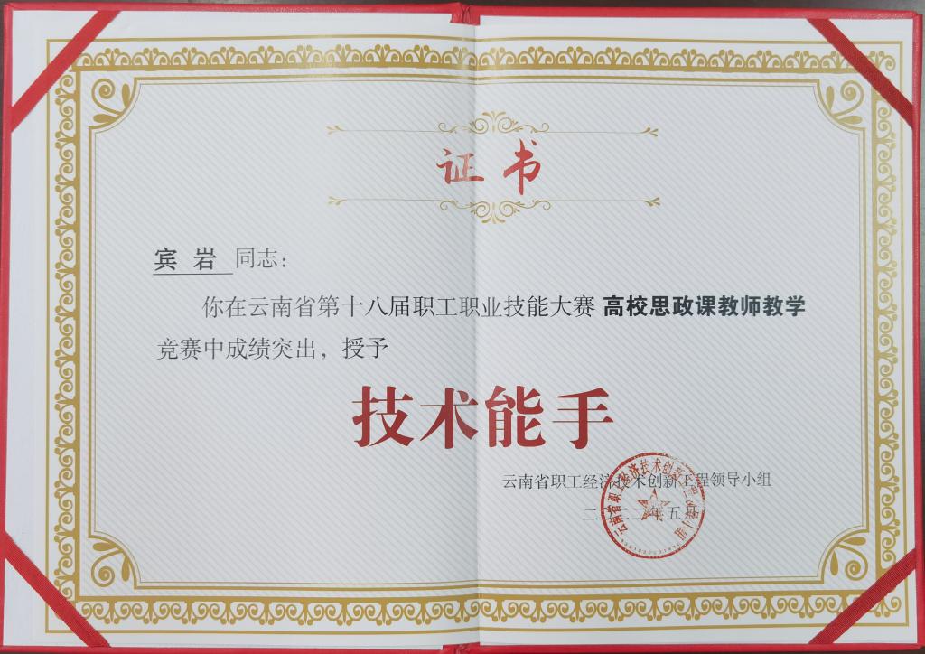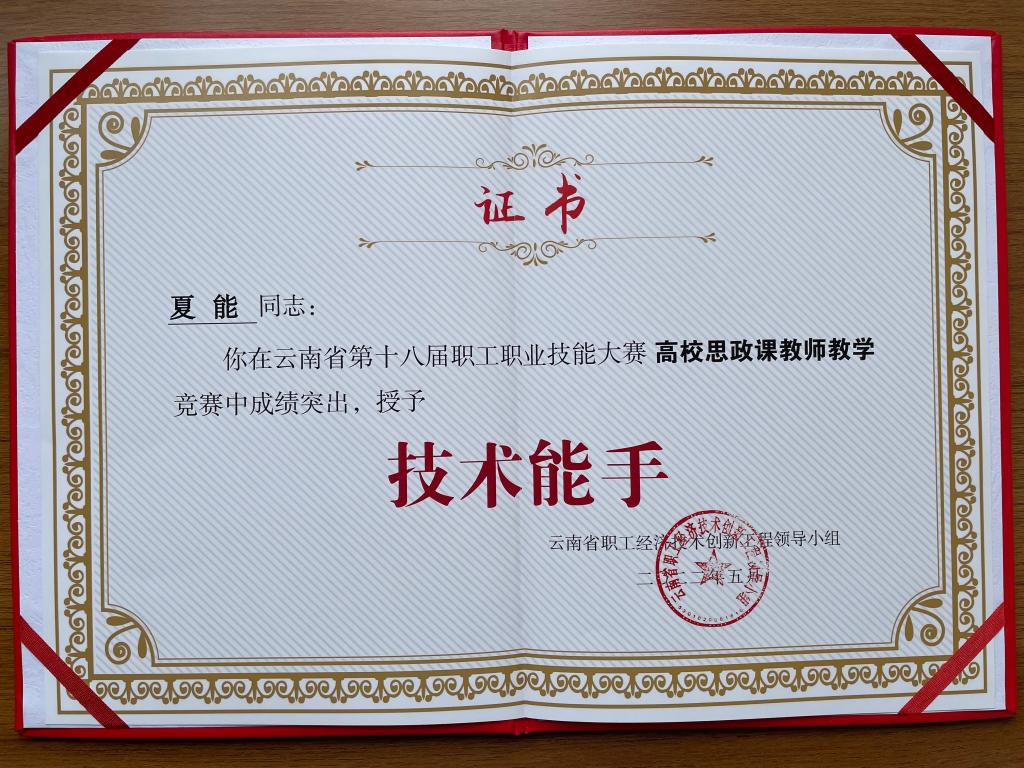 今年5月,根据云南省职工经济技术、创新工程领导小组“关于授予云南省第十八届职工职业技能大赛优秀选手技术状元和技术能手称号的决定”(云职创〔2022〕1号)文件,买球马院青年教师夏能、宾岩被云南省职工经济技术创新工程领导小组授予云南省第十八届职工职业技能大赛——云南省高校思政课教师教学“技术能手”称号。