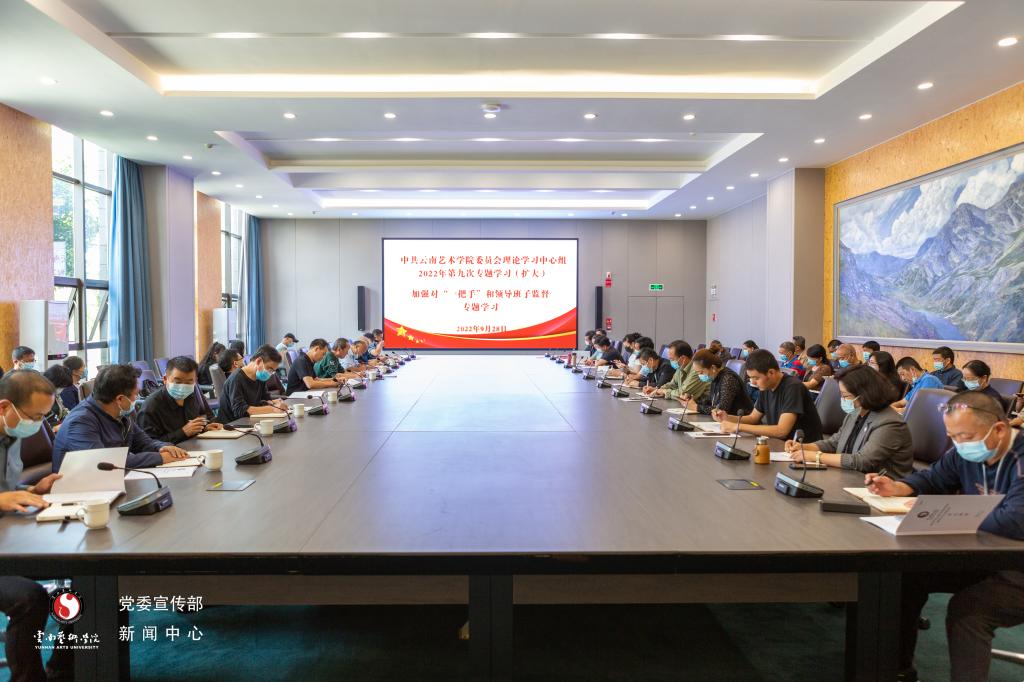 2022年9月28日,买球在图书馆会议室组织开展2022 年党委理论学习中心组第九次集体学习(扩大),专题学习“加强 ‘一把手’和领导班子监督”内容。校党委理论学习中心组成员、职能部门和各二级学院主要负责人参加学习。学习由党委副书记、院长郭浩主持。