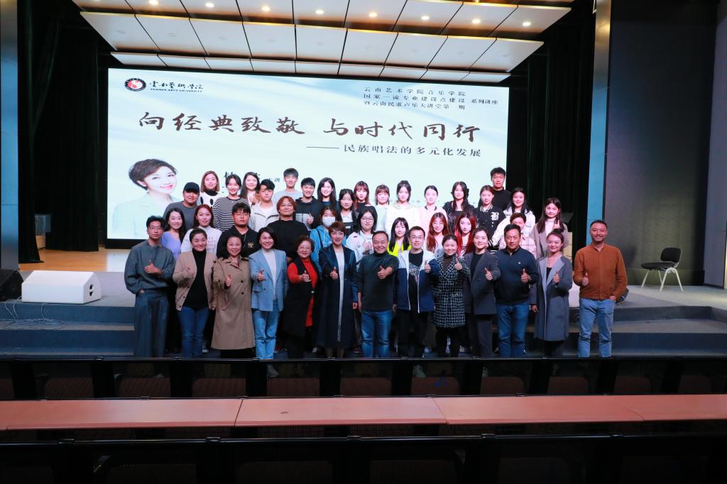 林林教授开篇引入了中国古代文献中对声乐的经典论述,并列举了建国以来涌现出的民族声乐方向具有代表性的歌唱家,如王昆、郭兰英、郭颂、胡松华、彭丽媛、李谷一、阎维文、雷佳等,通过聆听其代表作对每位歌唱家的演唱方法和表演风格进行分析和探究,总结出我国民族声乐正朝着唱法多元化、风格多样化的方向发展。林院长谈道:“每一种风格都别具特色,都有其存在的必要性,只要能正确地表达情感,符合当时的时代审美,是老百姓喜欢的,接受的,这种风格或唱法就有它存在的必要性”。接下来,林林教授又列举了云南民歌的代表人物,如黄虹、杜丽华、宗庸卓玛、李怀秀、李怀福、茸芭莘那、新稻子组合等,逐个介绍其不同的演唱风格、嗓音特点,并解析云南民歌演唱的一些特殊技巧及语言特点魅力。最后,林林教授通过分享自己的演唱的现代京剧《黛诺》片段,讲解了京剧的一些发声技巧,让学生了解了云南少数民族京剧《黛诺》是如何把云南景颇族音乐元素运用到戏曲音乐中的,并提出了云南音乐未来创作的方向。