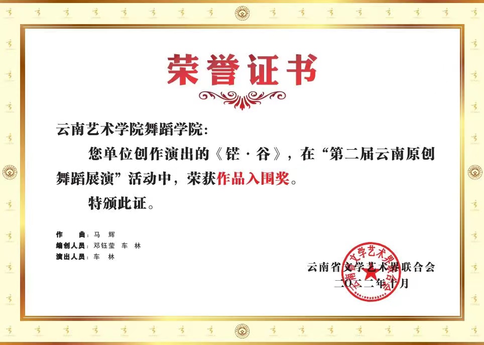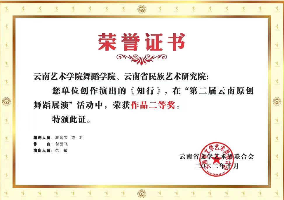 2022年10月26日,第二届云南原创舞蹈展演在云南省歌舞剧院开幕。买球投注官方网站高度重视,舞蹈学院精心组织,积极备赛,经过激烈地角逐,选送的傣族群舞《生命的摇篮》荣获作品一等奖,现代舞独舞《知行》荣获作品二等奖,哈尼族独舞《铓·谷》荣获作品入围奖,买球投注官方网站舞蹈学院荣获优秀组织奖。