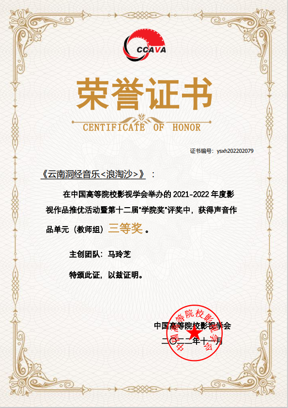 在年度学术成果、影视作品推优活动暨第十二届“学院奖”颁奖仪式上,王智教授的《白门楼》京剧录音作品荣获声音作品单元三等奖(教师组);马玲芝老师的《浪淘沙》云南洞经音乐录音作品荣获声音作品单元三等奖(教师组)。21级影视声音创作研究生杨硕、张奂、林暄、赵爽团队的《我的老师张桂梅》(指导老师:王智)荣获声音作品单元二等奖。录音系师生在创作、科研等方面积极谋划和开展相关工作,不断推进“双万计划”录音艺术省级一流专业建设。