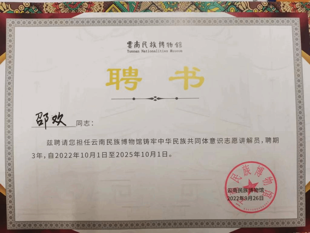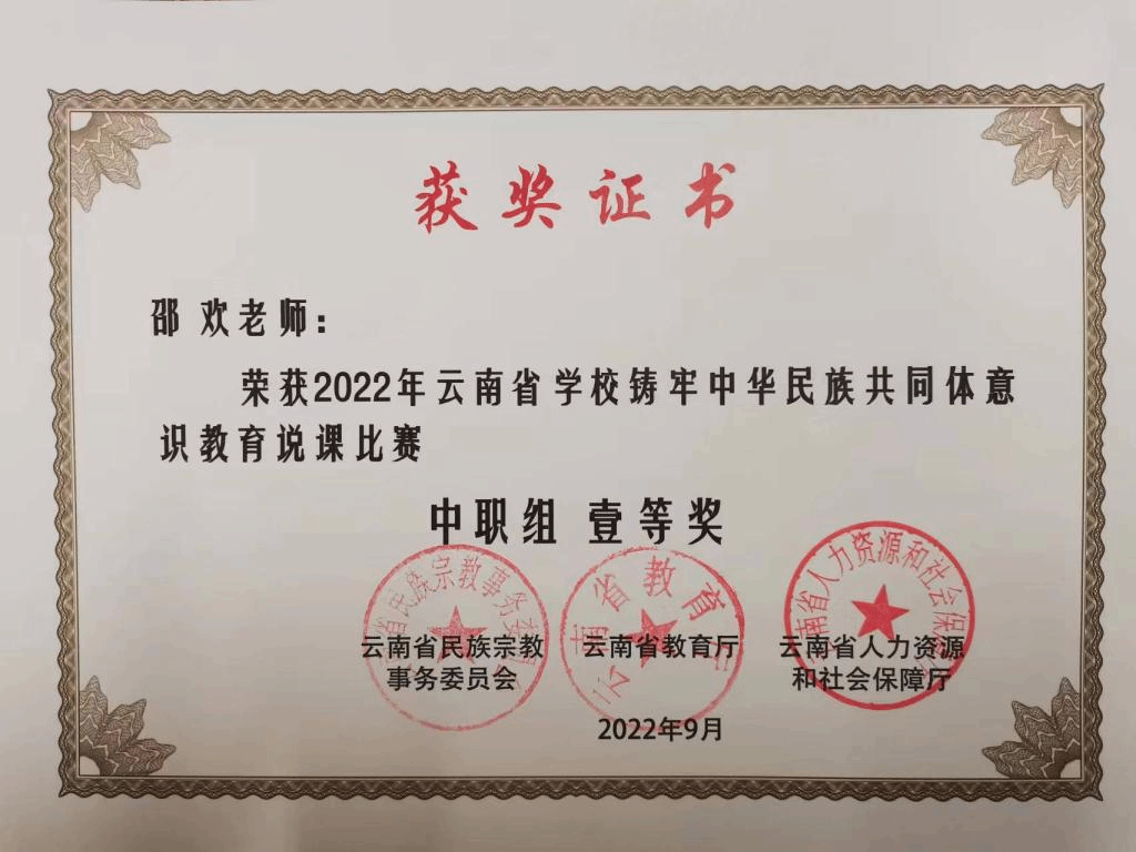 本次比赛历时两天,186名教师参加了2022 年云南省学校铸牢中华民族共同体意识教育说课比赛。说课比赛分小学组、初中组、普通高中组、中职组,经评委会公平、公正评判,产生了各组一等奖、二等奖、三等奖。买球邵欢同志通过激烈角逐,不负众望,最终获得本次说课比赛中职组一等奖殊荣,与此同时,该同志成绩突出,教授角度具有较为鲜明的创新性,被云南民族博物馆聘为铸牢中华民族共同体意识志愿讲解员。