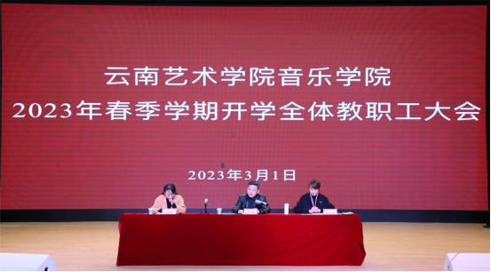 为切实把思想和行动统一到校党委和行政决策部署上来,全面贯彻党的二十大精神,扎实推进学校第五次党代会重点任务落实落地,深入学习贯彻买球投注官方网站2023年春季学期开学工作部署会上的讲话精神,确保新学期开好局、起好步,2023年3月 1 日下午,音乐学院于安康音乐厅召开了2023年春季学期开学全体教职工大会。会议由党总支纳海书记主持,音乐学院党政领导班子和全体教职工参加了会议。