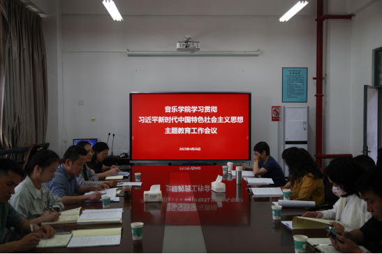 2023年4月26日14:00,音乐学院党总支在学院A301会议室召开学习贯彻习近平新时代中国特色社会主义思想主题教育工作会议,学院领导班子成员、党总支委员、科室负责人、教学系系主任、各党支部支委参加会议,音乐学院党总支书记纳海主持会议。